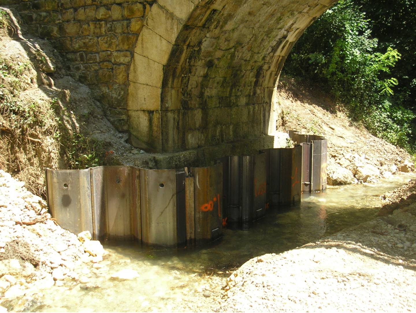 Soutènement sous un ouvrage existant, réalisé en passes alternées pour ne pas provoquer de désordres sur l’ouvrage. Les RSO sont associées à des micropieux et des tirants d’ancrage.
